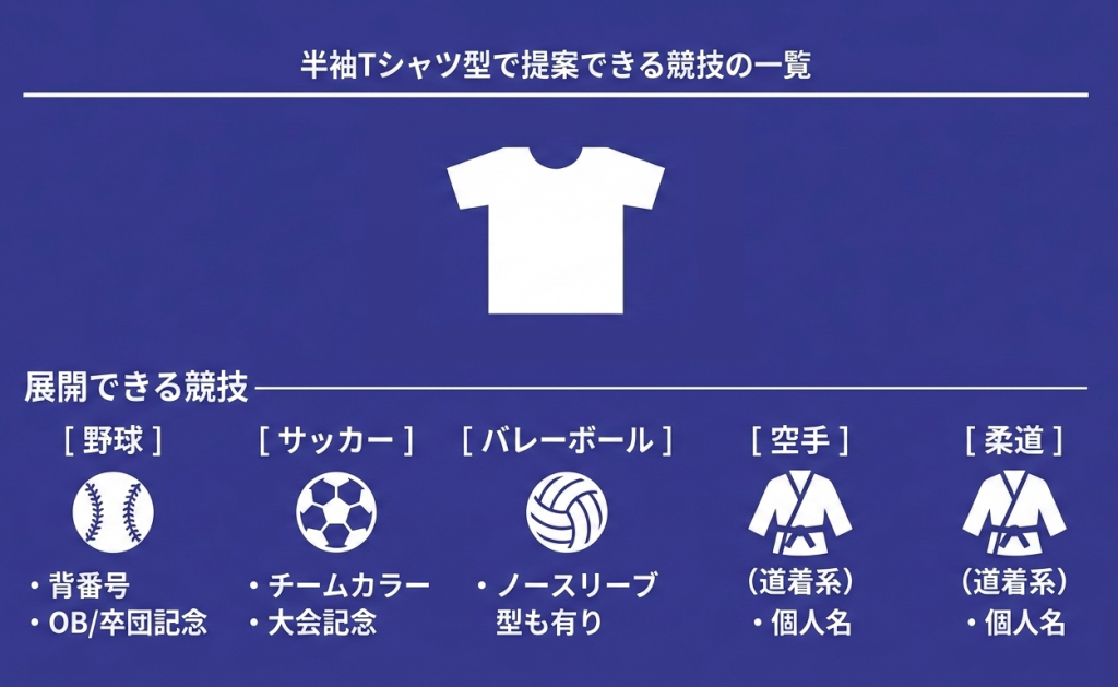 半袖Tシャツ型を使うことで、野球・サッカー・バレーボール・空手・柔道へ横断的に展開できます。