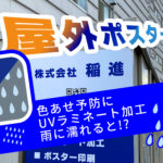 屋外ポスター!塩ビシート+色あせ予防に紫外線カットラミネート加工。雨に濡れると!?